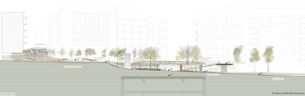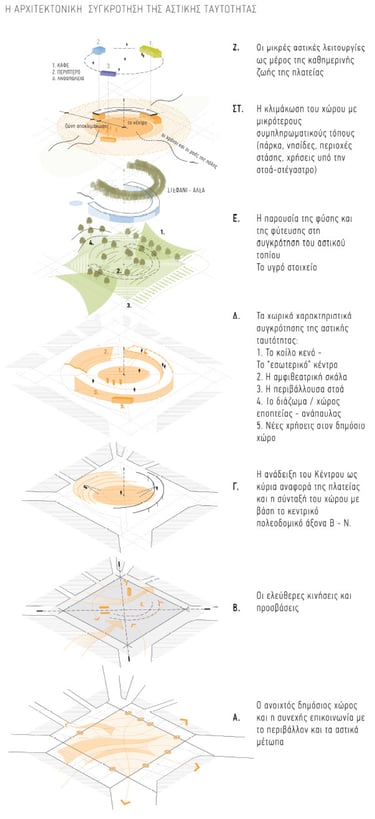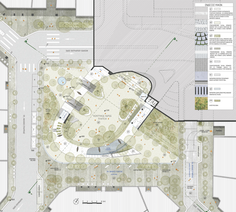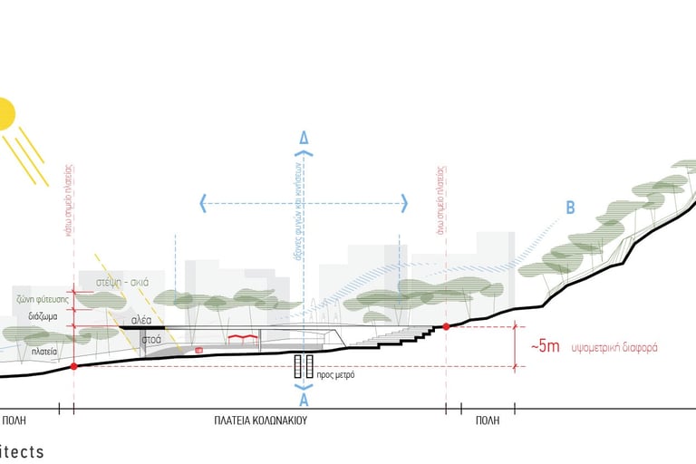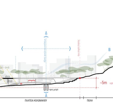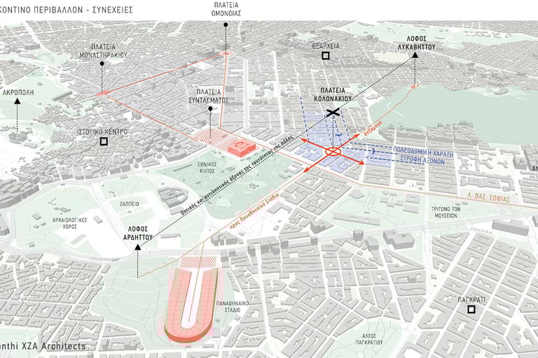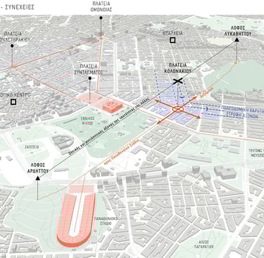 As the square will connect, via the metro, to destinations beyond its traditional borders, determining its urban identity necessitates emphasizing its self-presentation. The uniqueness of its location, where the slopes of Lycabettus meet, the vibrant presence of the northern sidewalks, the topographical relief extending to Herod Atticus Street and the Panathenaic Stadium, led to the adoption of the N-S axis as the central perceptual axis defining the city’s identity.