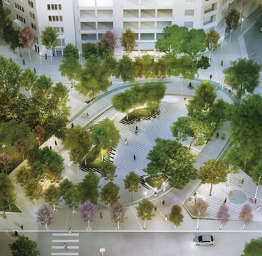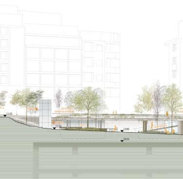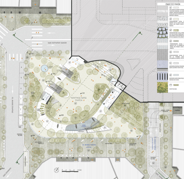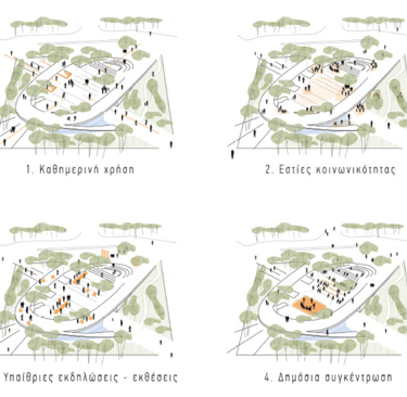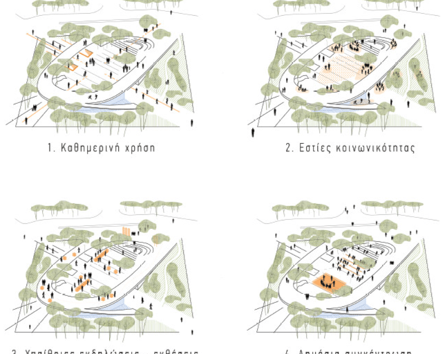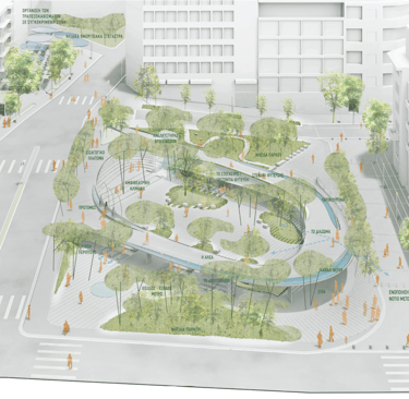 “Very interesting and bold proposal for the overall redesign of the square in relation to the surrounding urban fabric. It has successfully addressed the difference in elevation and accessibility. It demonstrates a solid understanding of environmental design, materiality, and the broader urban scale. Very good diagnosis of the square’s urban context and of the height differences, which inform the design approach. The main goals are to bring life back to the center of the square, to promote urban mobility and walking, as well as to restore the natural environment.”– Excerpt from the jury proceedings on the proposal.