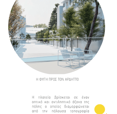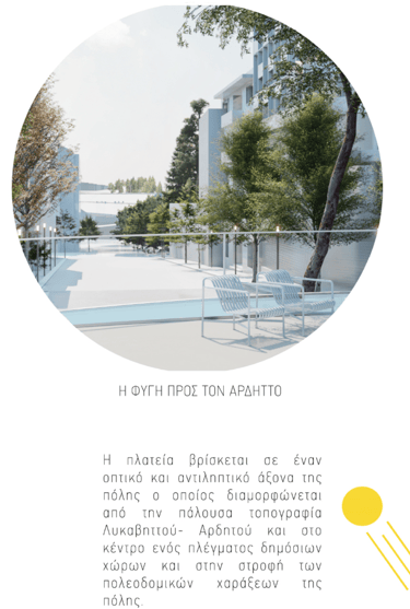 The square’s formation relies on the major Lycabettus – Ardittos axis. The vistas, visible from the square, serve as orientation points, providing an understanding of the city’s large scale. Simultaneously, the diagonal routes of the nearby E-W axis (Kanari & Kapsali Str.), connecting Kolonaki to the City Centre, the areas of parks, museums, and Ampelokipoi area, are utilized as a second compositional axis of flow, communication, and approach, forming an informal meeting intersection at the centre of the square’s public space. The entrance and exit of the metro are situated on this axis, contributing to the square as a meeting place, interface, passage, and stop, recalling memories of everyday mobility.